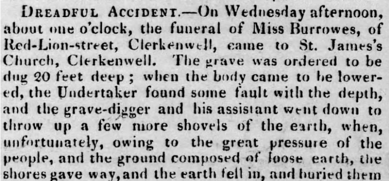 The two men started enlarging the grave as the mourners stood at the graveside watching on when ‘owing to the great pressure of the people…the shores gave way, and the earth fell in, and buried them under its weight; several men were immediately set about shovelling away the earth.’