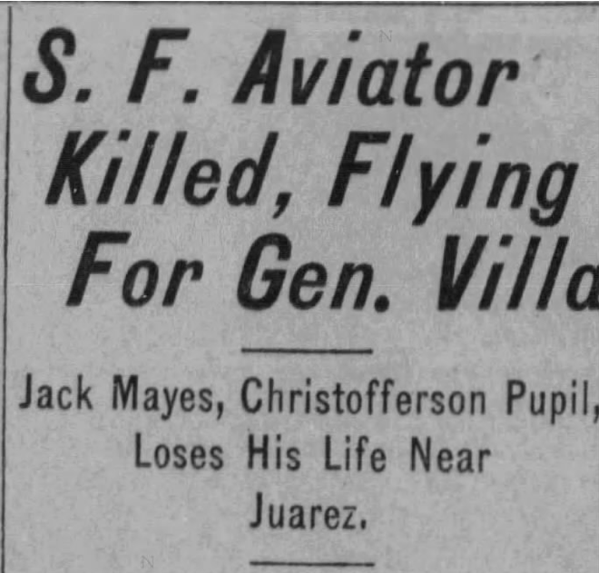 23-year-old Jack Mayes, a resident of San Francisco, was flying a Curtiss biplane which crashed into a building at Aguascalientes, just south of Juarez, Mexico. Silas Christofferson, the well-known early birdman, knew Mayes and taught him at his flying school. He described him to newspapers as ‘a steady and reliable flyer.’