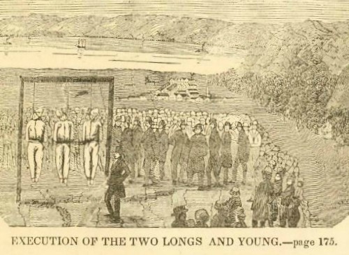 Granville Young was buried locally, but the site of his grave is unknown. The Long brothers had further adventures after they were hanged. Aaron’s corpse was shipped to Dr. P.P. Gregg at St. Louis for ‘scientific study’; as will be recalled, Dr. Gregg was the man who arrived at Galena with John Baxter in tow.