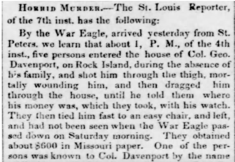 On 4 July 1845, Geoge Davenport was unwell and alone in his Rock Island home while his family was at a ‘Sunday School celebration.’ Five men entered the Davenport residence. The gang of home invaders accosted the colonel and then shot him in the thigh.