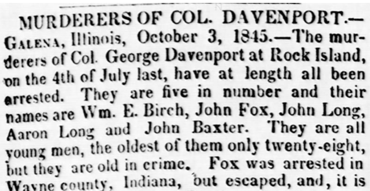 Towards the end of August 1845, a reward of $2500 had been offered for the capture of those guilty of the slaying of Col. Davenport. The Governor of Illinois donated $1000, while the dead man’s friends offered up $1500.