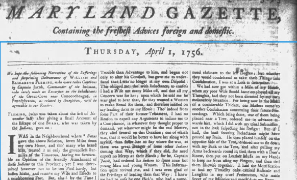 William Fleming’s story was featured in the Thursday April 1 issue of the Maryland Gazette. Elizabeth’s story was retold the following Thursday April 8.