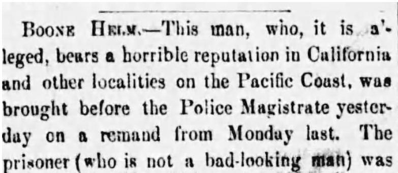 Boone Helm, arrested as a ‘suspicious character’ by Sergeant Blake of the Victoria Police, appeared in the Police Court on Monday, 13 October. Blake told the court that he had seen Helm walking the streets of Victoria on Saturday night.