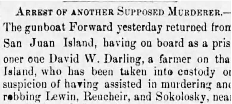 The morning of Friday, August 15, saw the appearance of David W. Darling in the Police Court in Victoria. Darling was a farmer and former captain of the schooner Black Hawk, which plied the waters between San Juan Island and Victoria.