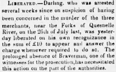 The following Monday, Henry Dierick, from Yreka, California, appeared in the Police Court. He had ‘been arrested on suspicion of being concerned in the late murders at Cariboo.’ He was released from custody, without ‘the least stain on his character.’