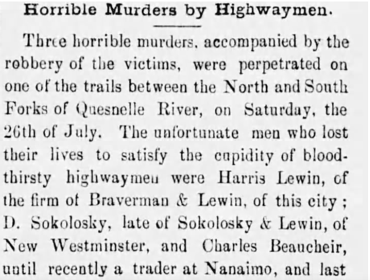 As was the case for Averena Rice, the Killers of David Sokolosky, Herman Lewin and Charles Beaucheir were never found accountable for the crimes that so shocked the Cariboo region in the summer of 1862.