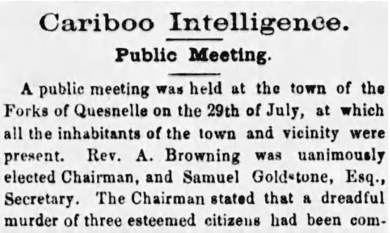 On Tuesday, 29 July, the day after the discovery of the ‘Horrible Murders’, a public meeting was held in the town of the Forks of Quesnelle, in which all inhabitants of the town and the surrounding area were in attendance.