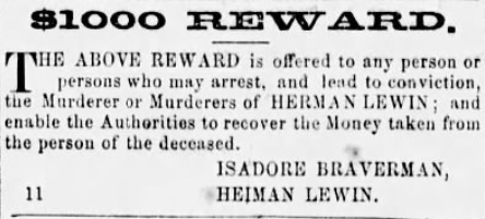 It was around this time that Herman Lewin’s brother, Heiman, and his business partner, Isadore Braverman, posted a reward of $1,000 in the Victoria newspapers. The reward would be paid on the conviction of Herman Lewin’s killers and the return of the gold dust.