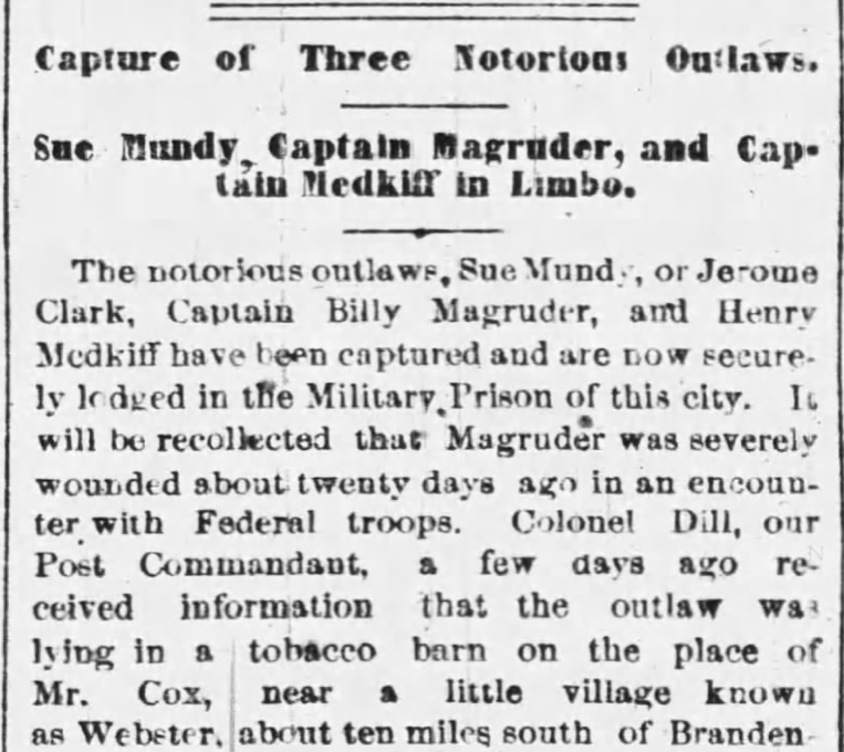 On January 10, 1865, The Louisville Journal printed an article which was published in several other newspapers in the following weeks, stating that: ‘We have it on good authority that Sue Monday is not a female, as is generally believed, but is in reality Jerome Clark, a son of Hector M. Clark, of Simpson County Ky.,…also cousin to Tandy Clark, now in the State Prison for robbing the mails.’