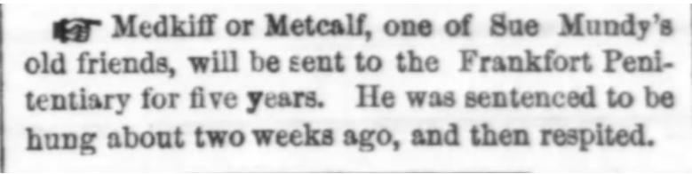 Henry Medkiff, the last of the three Confederate guerrillas captured in the tobacco barn, was sentenced to be hanged in May 1865. He had his sentence respited and was sent to Frankfort Penitentiary for five years.