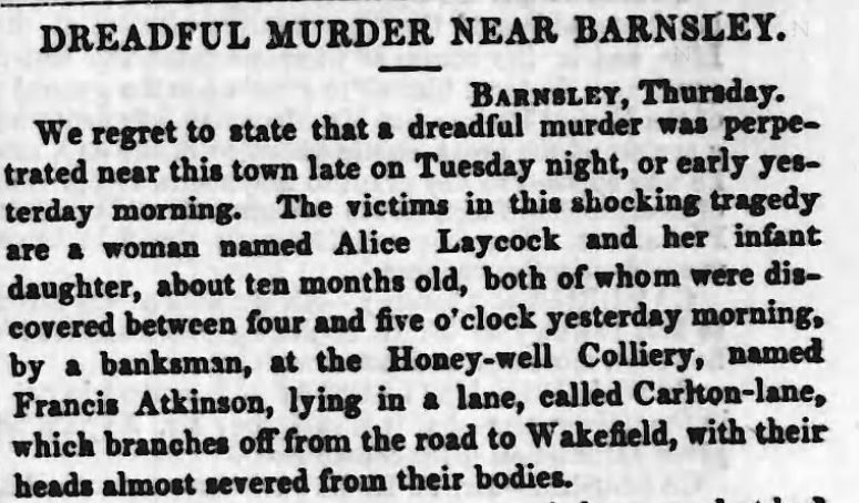 Early on the morning of Wednesday, 24 March 1852, Francis Atkinson was walking to work at a colliery in the South Yorkshire village of Smithies, when, passing along Carlton Lane, he discovered the bodies of a woman and a baby lying in an embrace, ‘weltering in a pool of blood.’